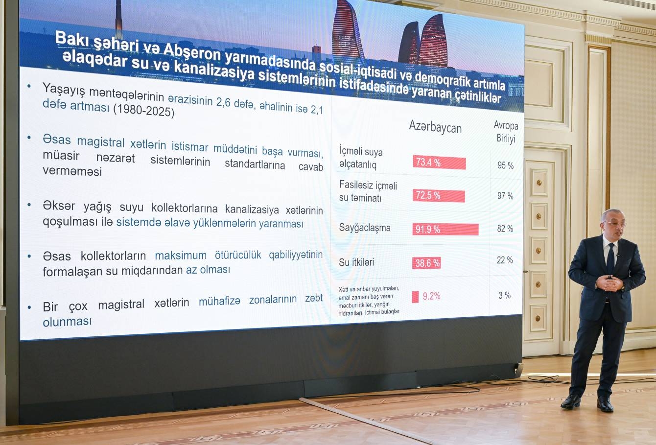 Prezident İlham Əliyev Bakı və Abşeron yarımadasında hələ də mövcud olan problemləri ətraflı şərh edib. Hazırda fasiləsiz içməli su ilə təmin olunan əhali yalnız 70 faiz təşkil edir və su itkiləri 40–45 faiz səviyyəsindədir. Bu, mövcud ehtiyatlardan səmərəli istifadəyə ciddi maneə yaradır. Kanalizasiya xidməti isə əhalinin yalnız 50 faizinə təmin olunur, bu da ətraf mühit və sosial rifah baxımından problemlər yaradır.